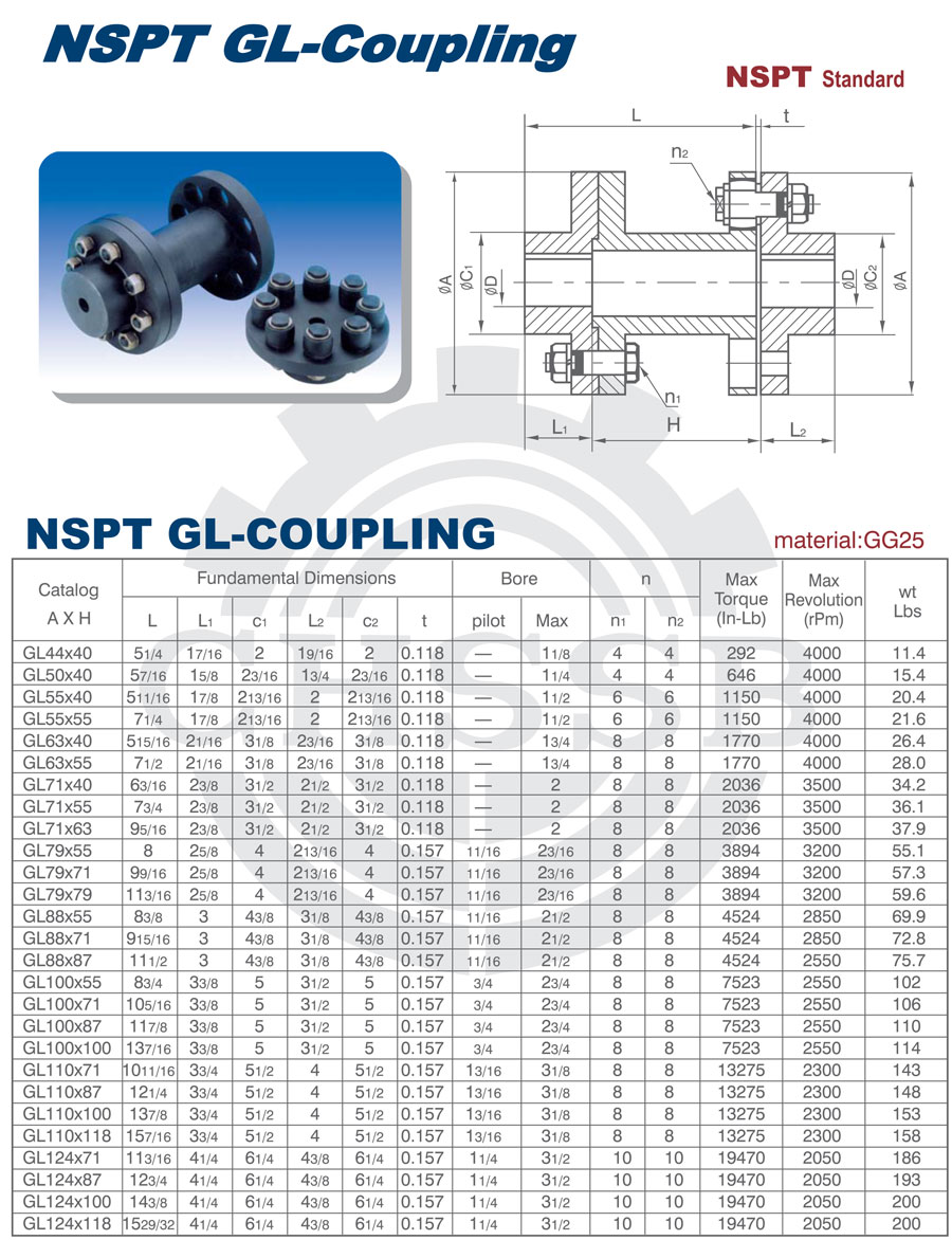 產(chǎn)品范圍: 美標(biāo)/歐標(biāo):(GL44-GL124) 英制尺寸產(chǎn)品(適用于美標(biāo)市場) 公制尺寸產(chǎn)品(適用于歐標(biāo)市場) GL型聯(lián)軸器