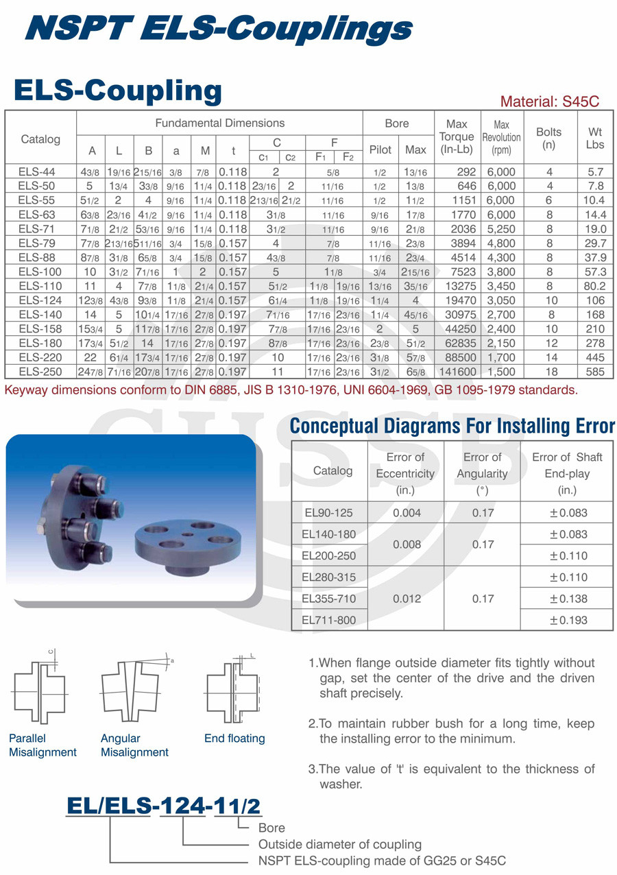 產(chǎn)品范圍: 美標(biāo):(EL/ELS) 歐標(biāo):(EL/ELS) 英制尺寸產(chǎn)品(適用于美標(biāo)市場) 公制尺寸產(chǎn)品(適用于歐標(biāo)市場) EL型聯(lián)軸器 ELS型聯(lián)軸器